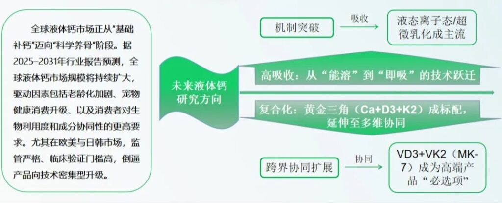 液体钙未来发展趋势:高吸收、复合化、精准化、绿色化。