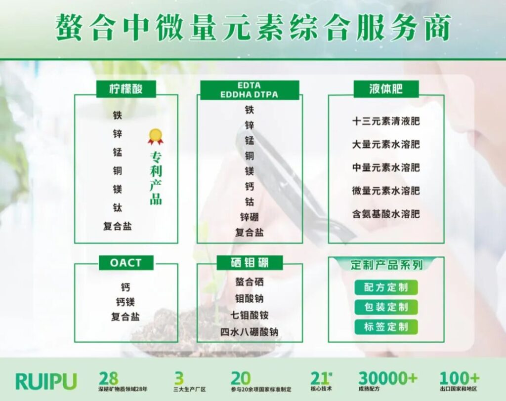 郑州瑞普植物营养事业部将重磅展示基于OACT技术的系列产品及柠檬酸螯合盐产品。