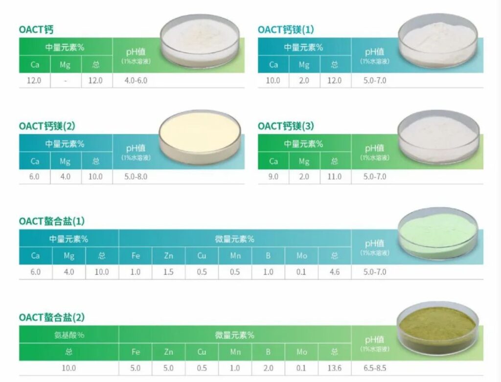 OACT即复合酸螯合或者有机酸螯合,是指采用两种或两种以上有机酸共同螯合金属离子的新型螯合技术。该技术根据各种有益有机酸对金属离子螯合特性的不同,对有机酸进行合理选用和科学配伍。螯合产物中的小分子天然有机酸可以参与调节植物的生长发育,金属元素会被协同高效吸收利用,从而达到双优双补的效果。