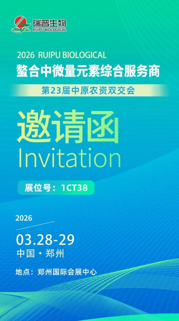 2026年3月28日-29日,郑州国际会展中心1CT38展位,郑州瑞普生物恭候各位新老朋友莅临。我们将以开放的姿态、专业的技术,与您探讨螯合微量元素的新应用,携手共赢农资大市场,共奔高产丰收路!